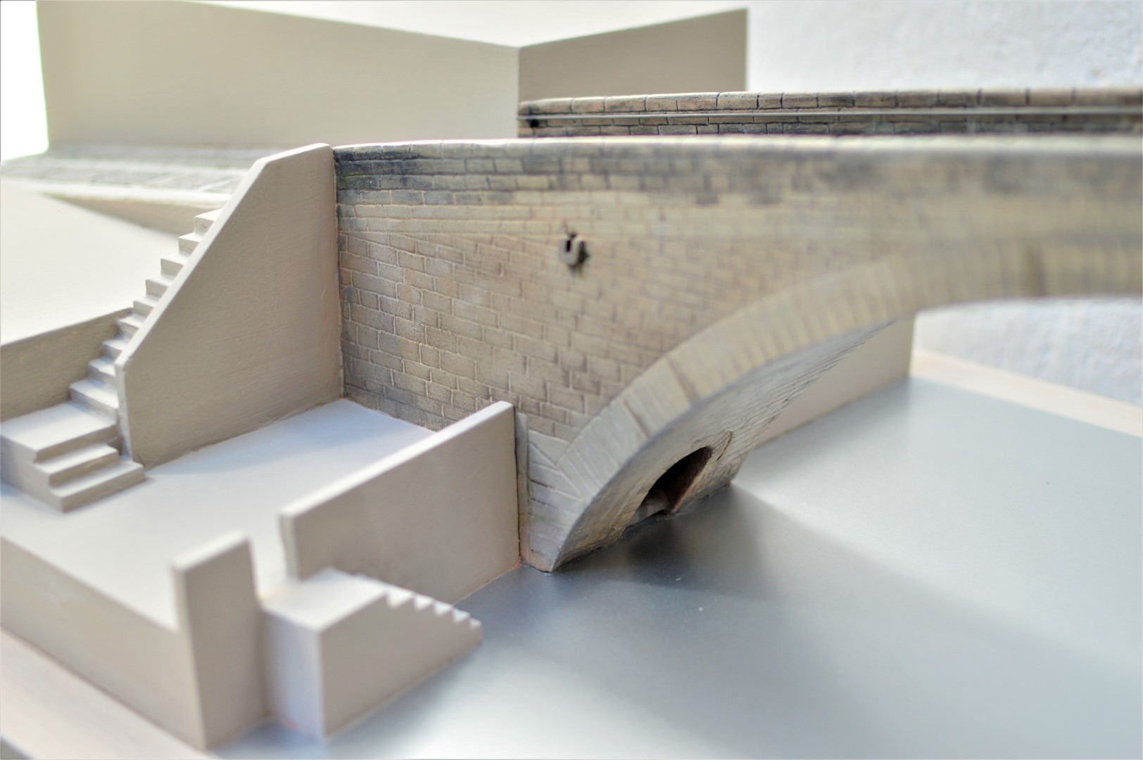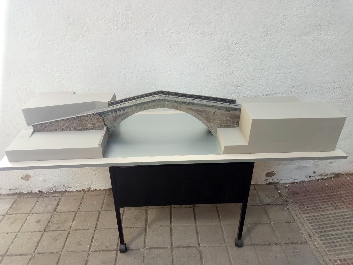 Maqueta realizada manualmente del Puente de la Cárcel o del Ladrón en Estella. A escala 1:50, el tratamiento es diferente para la construcción y para su entorno.