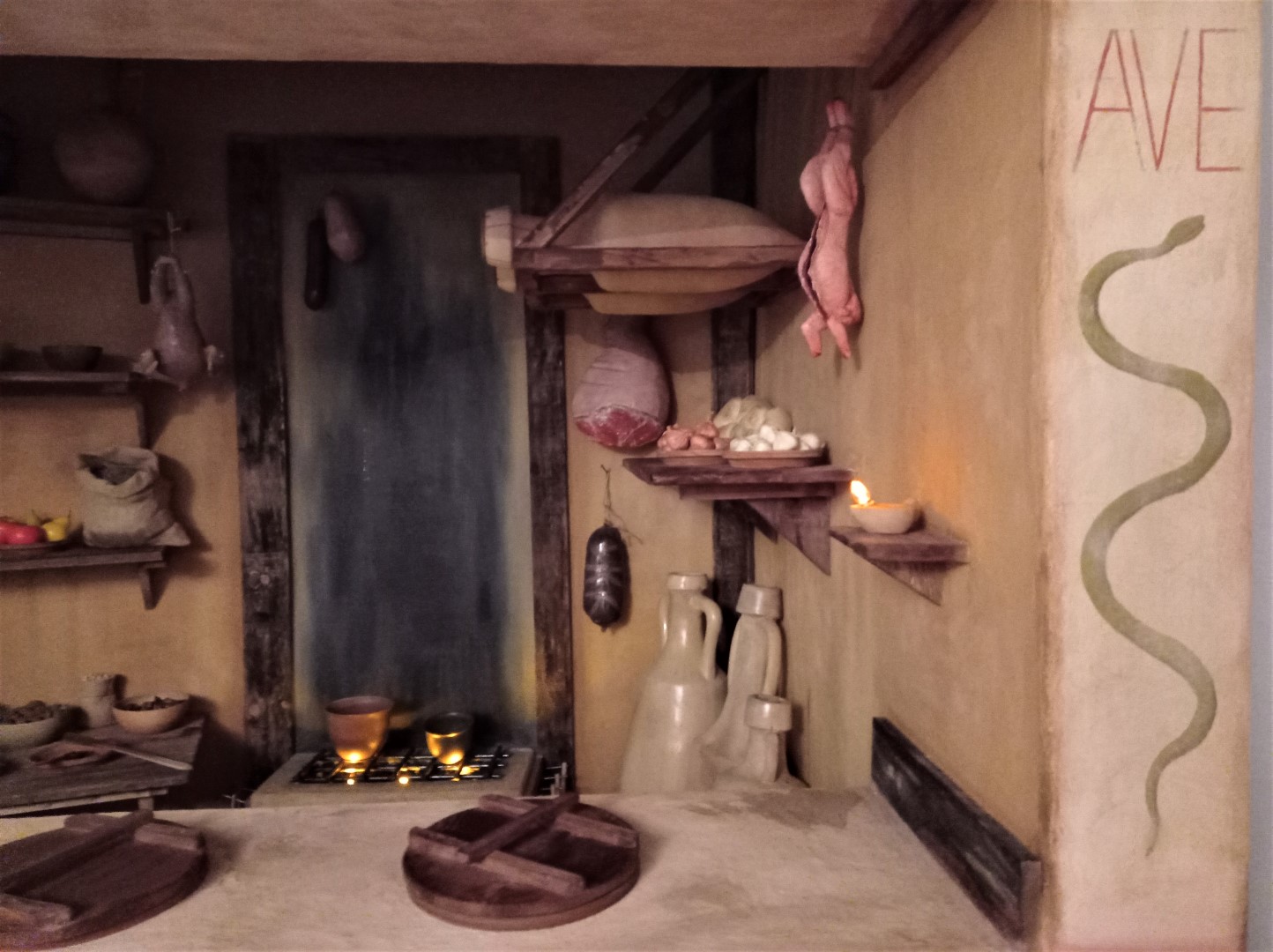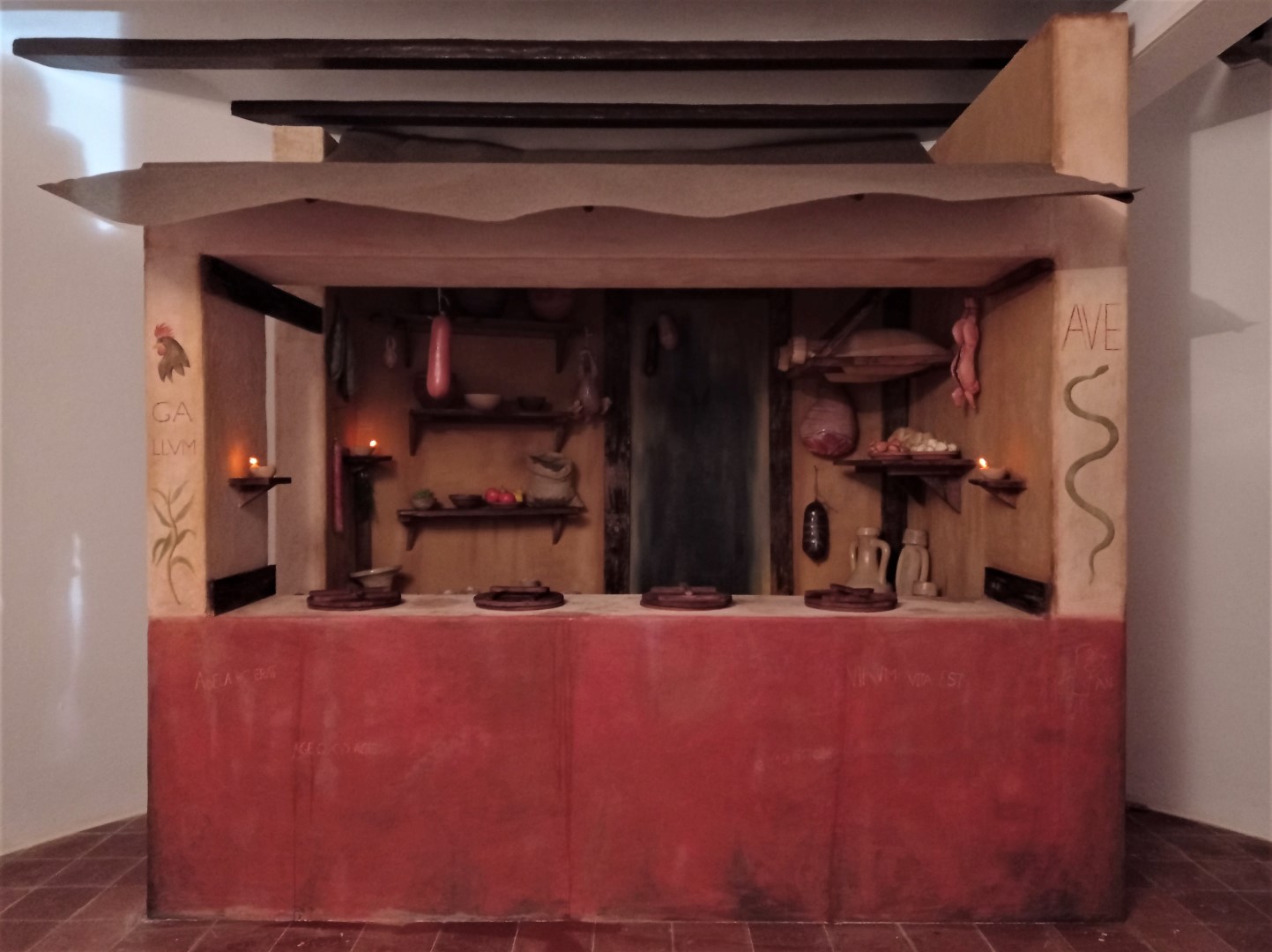 Reconstrucción ideal de tabernae romana a escala 1:1 con alimentos, ánforas de vino etc.